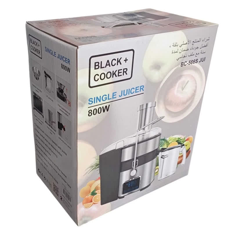 آبمیوه گیری تک کاره بلک کوکر مدل BC-566S از موتور بسیار قدرتمند با توانایی 800 واتی بهره می برد. علاوه بر این شما می توانید سرعت و قدرت دستگاه را به 5 صورت مختلف تنظیم نمایید. در ضمن شما تنظیمات سرعت را می توانید از طریق دکمه های لمسی قرار گرفته بر روی بدنه بر روی دستگاه عملی نمایید. ناگفته نماند که این محصول از جنس بسیار عالی ساخته شده است و زیبایی آن چشم نواز می باشد. توجه نمایید که جنس بدنه این محصول از نوعی پلاستیک فشرده شده و اتسل ضد زنگ ساخته شده است. جنس دیگر ظروف نیز از شیشه نکشن می باشد. از دیگرخصوصیات این محصول خارق العاده می توان به تیغه های ساخته شده از استیل ضد زنگ اشاره نمود. در ضمن شایان ذکر است که قطعات این محصول قابلیت شستشو در ماشین ظرفشویی را دارند. از دیگر قابلیت های آبمیوه گیری تک کاره بلک کوکر برخورداری از سیستم ضد چکه می باشد. همچنین برخورداری از پایه های ضد لغزش نیز از سایر خصوصیات آن به شمار می رود که از تکان خوردن دستگه جلوگری می کند. همچنین این آبمیوه گیر از مخزن تفاله و مخزن آبمیوه جدا بهره می برد. ظرف این محصول نیز ظرفیت بالایی دارند. به گونه ای که ظرفیت مخزن تفاله برابر با 2.2 لیتر است. که تمامی این قابلیت ها در کنار هم سبب شده اند تا این محصول بسیار عالی عمل نماید و بسیار کاربردی باشد.